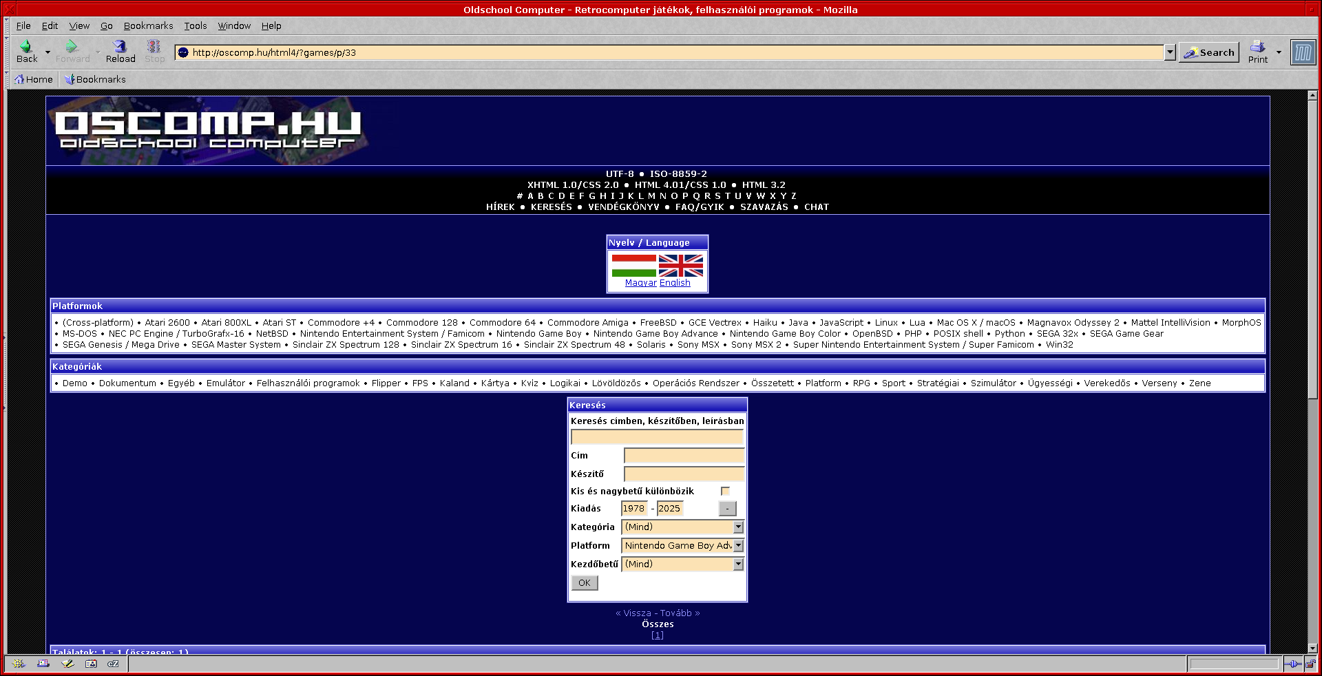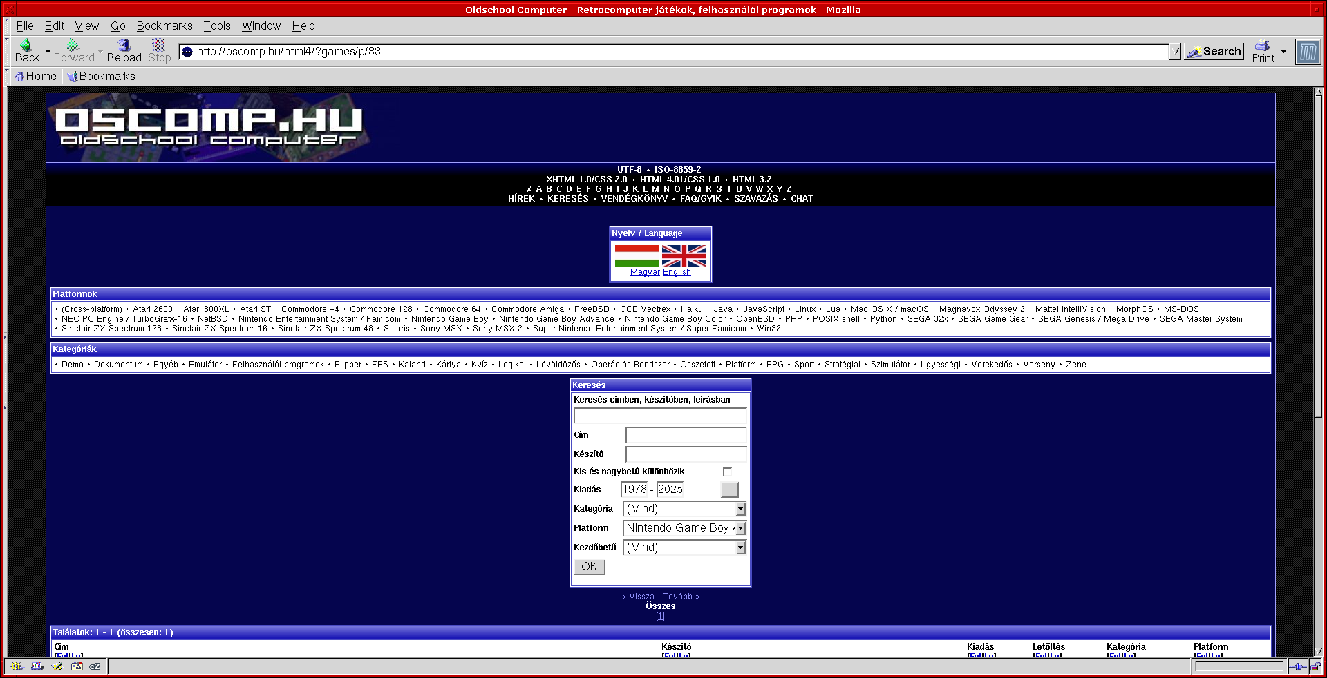 Anno (mintha olyan oreg lennek) ezt hasznaltam, ezzel vagyok komfortos a Presto Opera mellett. Ugye a retrozas az a modern korbol valo menekves is, ezaltal szamomra ez a felulet meg browser adja a komfortot. Ha jol emlekszem 70db vegyesfelvagott kabel. A HTML 4.01 + CSS 1.0 menuje Mozilla 1.7.8 alatt nem mukodik megfeleloen. :] Adotartozas miatt szamoltak fel oket. :DDDDD Inkabb a trefos mint a (vodafos)one rothado koax. D: Udv baglyos linuxos Mozilla 1.7.3-rol. |